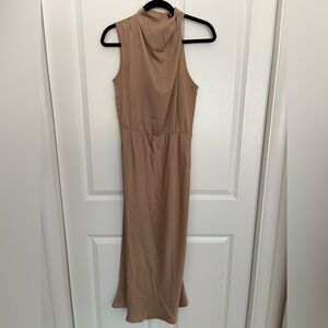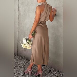 Step out in style with this chic brown maxi dress. Its sleeveless design and elegant drape make it a versatile choice for any event.