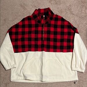 Stylish pullover featuring a red and black plaid pattern on the top and a white bottom. Perfect for casual wear. Gently used. Smoke/pet free home.