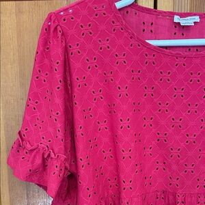 Bright pink blouse with eyelet design. Features ruffled sleeves and hem. Perfect for casual outings.