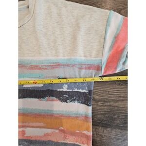 Stylish dolman top designed for casual comfort and a touch of artistic flair. This eye-catching shirt features a relaxed fit, short sleeves, and a unique color block pattern with brushstroke-style stripes in a spectrum of appealing hues. The rounded hem adds a modern touch to the overall silhouette. Wear this top for everyday errands, relaxed get-togethers with friends, or casual outings where comfort and style are equally important.