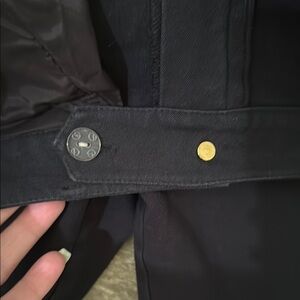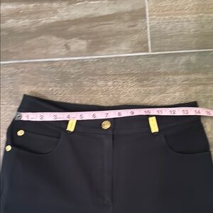 Elegant black trousers with striking gold accents. Ideal for versatile styling.