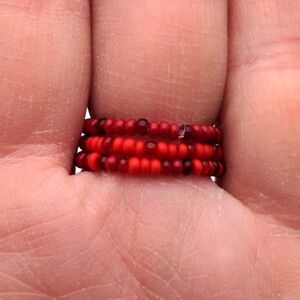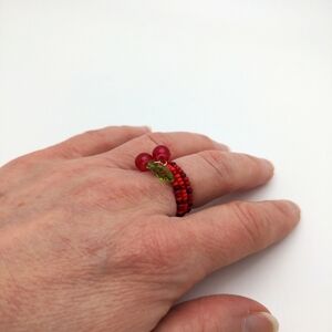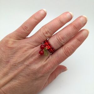 These limited edition rings are crafted from genuine Czech glass seed beads in bright and deep red hues. Its unique cherry dangle charm adds an eye-catching detail, perfect for whimsical jewelry enthusiasts.