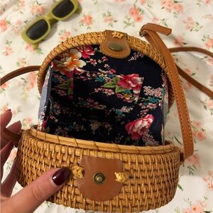 Chic woven rattan circle bag with a long tan strap. Perfect for casual outings. Features a firm, protective structure.