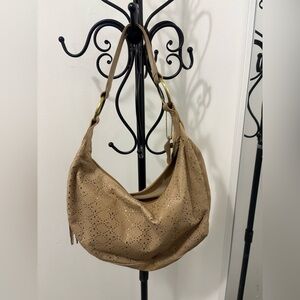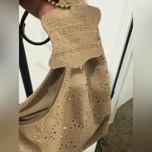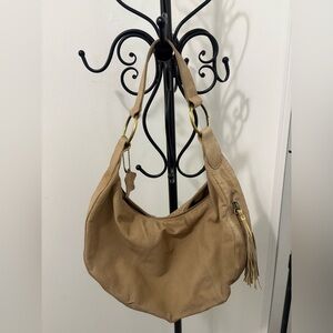 Elevate your style with this chic tan hobo bag, featuring elegant gold accents. Perfect for any occasion.
