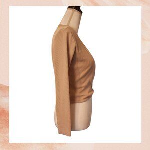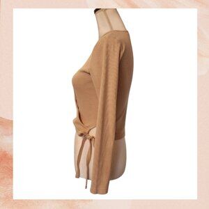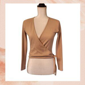 This chic tan long sleeve wrap top is a stylish addition to any wardrobe. Ideal for both casual and formal settings.