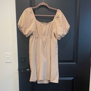 Step out in style with this chic tan mini dress. Featuring trendy puff sleeves, it's perfect for any occasion. Elevate your wardrobe with this versatile piece.