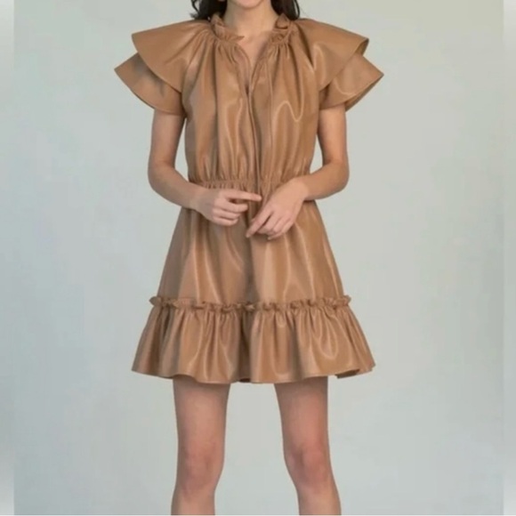 Elevate your wardrobe with this chic tan mini dress. Featuring stylish ruffle sleeves and a flattering fit, it's perfect for any occasion.