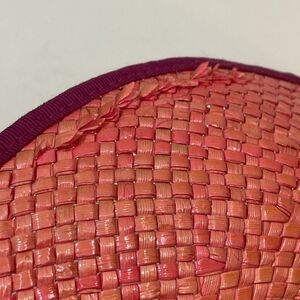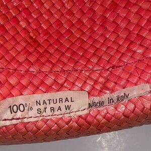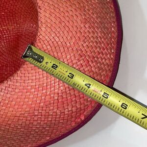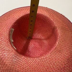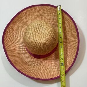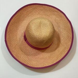 This stylish hat features a wide brim for optimal sun protection, crafted from natural woven materials in a tan hue. A contrasting pink band and trim add a touch of elegance, making it a perfect accessory for sunny outings.