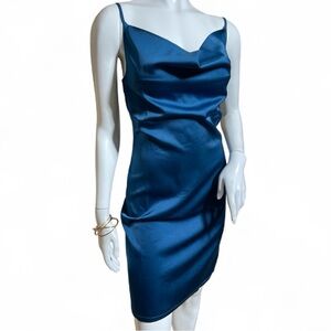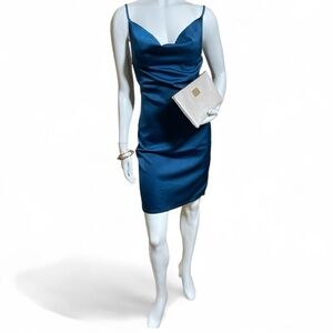 Step out in style with this chic teal satin mini dress. Its sleek silhouette and luxurious fabric make it a must-have for any wardrobe.