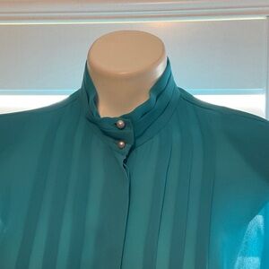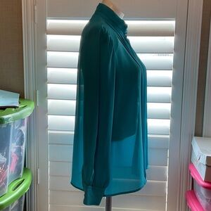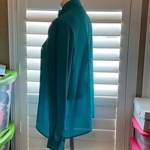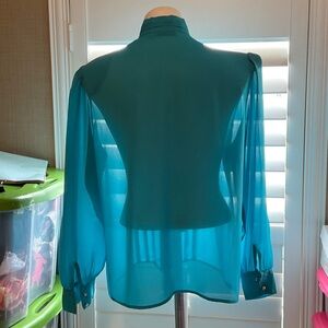 This chic teal sheer blouse offers a sophisticated look with its elegant design. Perfect for both casual and formal occasions.