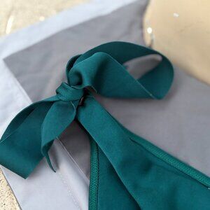 Elegant teal bikini with a unique one-shoulder design. Features stylish bow accents.