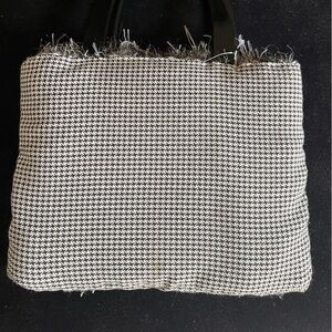 Crafted in striped knit crochet tweed fantasy faux fur with rounded black handles, lining is a black and white check.