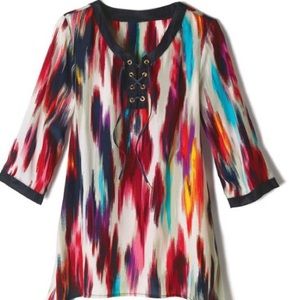 Long, tunic-length blouse with a hi-low hem, lace-up grommet neckline and vibrant multicolored print for a cool, boho chic look.