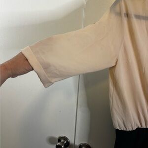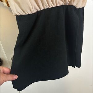 Adorable well loved romper. Cream top blouse with a black skort bottom. The blouse has a wrap V neck style that is enclosed. The back is identical to the front with a slightly deeper V, open. It’s a Rayon like material. Solid cream color. 3/4 sleeves.