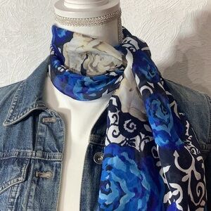 Elevate your style with the Blue and White Floral Scarf. This elegant accessory features a vibrant blue floral pattern on a soft white background, perfect for adding a touch of sophistication to any outfit.