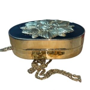 It is a small, rigid bag, often used for formal occasions, characterized by its oval shape, black glossy finish, and a prominent gold-toned floral or medallion-like embellishment on the front. It features a top handle and appears to also have a chain strap, suggesting it can be carried in multiple ways.