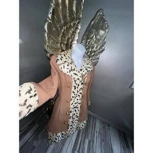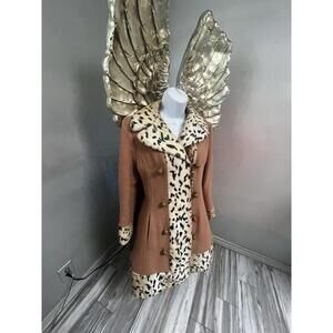 What truly elevates this piece to a statement garment is the dramatic trim of plush faux leopard print fur. This is a true vintage gem, offering an instant infusion of iconic mid-century mod style for your wardrobe. No other tags available.This coat remains in good pre-owned vintage condition, a testament to its quality and enduring appeal. As with many cherished garments of this age, it carries a small imperfection: there is a tiny slit (less than a quarter-inch in size) on the side of the camel fabric. This minor flaw is easy to repair and is clearly shown in the photos for your reference. The original care tag is still attached,. Measurements (Approximate - Fits Like a Size Small/Medium):
