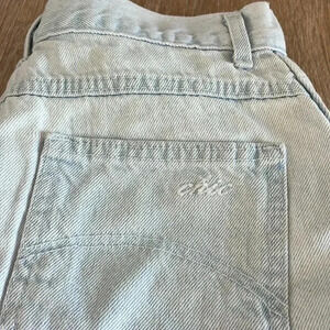 Vintage Chic high-waisted mom shorts in light blue acid wash denim. Classic 90s Bermuda length with a relaxed fit and soft, broken-in cotton. Flattering high rise and longer inseam make these a must-have for retro summer style.