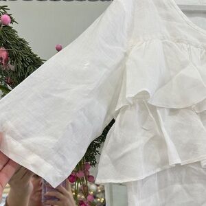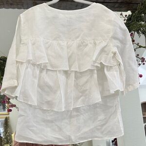 Elevate your wardrobe with this chic white blouse. Featuring a stylish button-down design and elegant ruffles, it's perfect for any occasion. 100% Ramio. This blouse was purchased in Argentina from a high-end local designer boutique