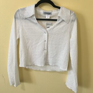 Elegant white cardigan with a textured design. Features a classic collar and button-up front. Perfect for layering.