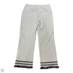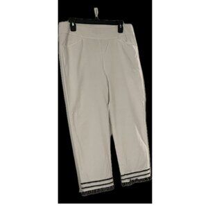 Stylish and comfortable white cropped pants featuring a flattering pull-on waistband and unique fringe and stripe trim at the hem. The midweight fabric provides structure while keeping them breathable — perfect for casual outings, resort wear, or summer events. Easy to dress up with wedges or keep casual with sandals.