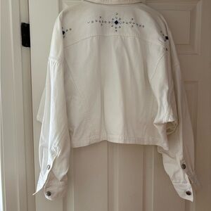 Elevate your style with this chic stunning embellishments of light blue & sapphire blue & silver studded on a white jean jacket, for a modern look. Has “2” pockets, 1 on each front side to use! Like new! Sexy & Classy & Gorgeous!!! By Freego.