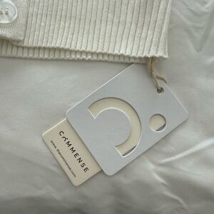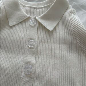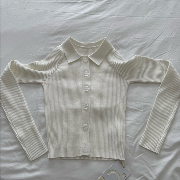 Elegant white ribbed cardigan with button-up front. Features a classic collar and long sleeves. Perfect for layering.