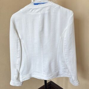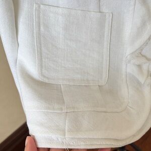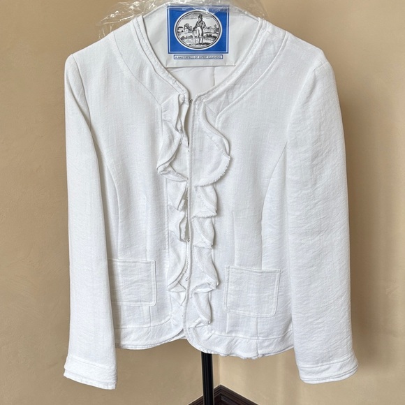 Elevate your wardrobe with this chic white ruffle blazer. Perfect for adding a touch of elegance to any ensemble.