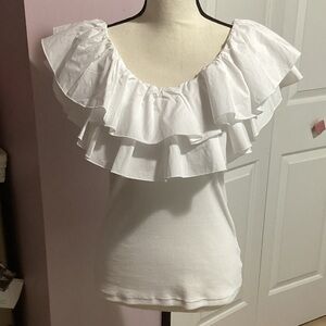 Elevate your style with this chic white ruffle blouse. Perfect for adding a touch of elegance to any outfit.