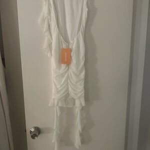 This chic white mini dress features elegant ruffles, perfect for a stylish look. Ideal for any occasion, it adds a touch of sophistication to your wardrobe.