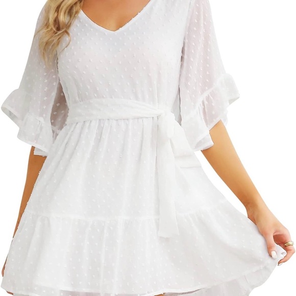Step out in style with this chic white ruffle mini dress. Perfect for any occasion, its soft fabric and elegant design ensure comfort and sophistication.
