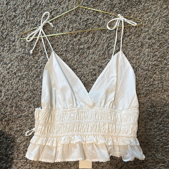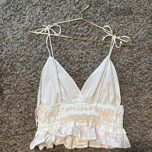 Stylish white camisole featuring delicate ruffle details and adjustable tie straps. Perfect for layering or wearing on its own.