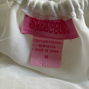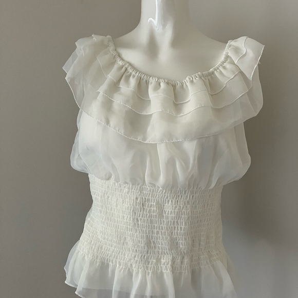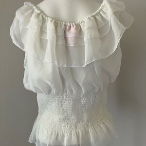This chic white blouse features elegant ruffles and a smocked waist, offering a stylish touch to any outfit. Perfect for both casual and formal occasions.