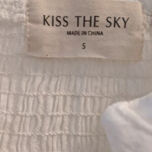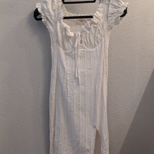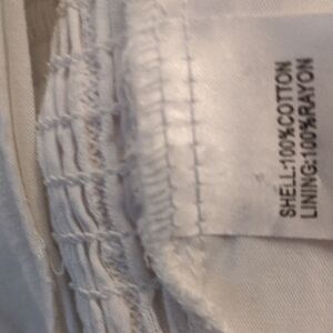 Step out in style with this chic white mini dress, featuring elegant ruffles in crisp yet soft cotton for a touch of sophistication. Perfect for any occasion. The outer is 100% cotton in front panel lining is 100% rayon. Noted is a repair/slight unravel at side slit as seen in photo.