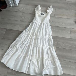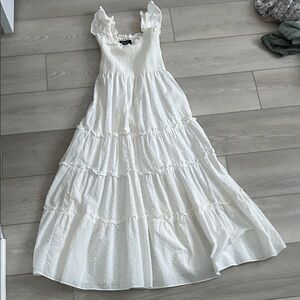 This chic white smocked maxi dress features elegant ruffles and a flowing silhouette. Perfect for any occasion, it offers a timeless and sophisticated look. Looks like hill house for a 1/4 of the price 🤩