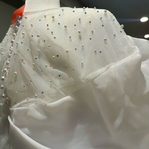 This chic white satin dress features a stunning sheer overlay, perfect for any elegant occasion. New with tags. Size 14/16