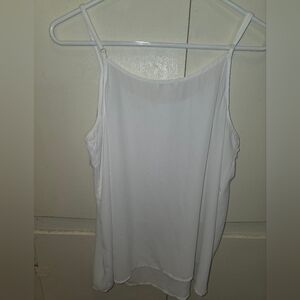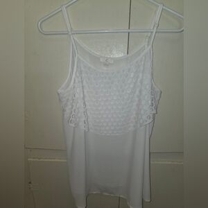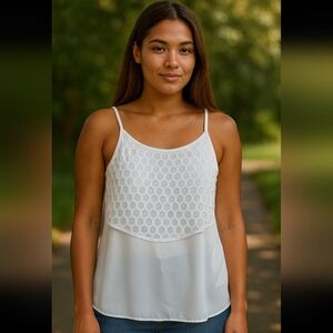 This stylish white tank top is perfect for any occasion! It's a size large and features a unique honeycomb or geometric pattern on the upper half, with a solid, flowing layer below. The sleeveless design and lightweight fabric make it an ideal choice for warmer weather.
