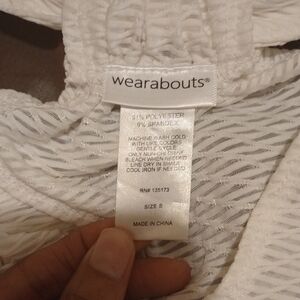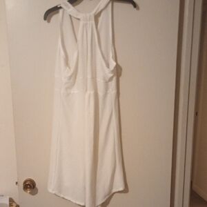 This chic white swimsuit coverup features a sleeveless design with a halter neckline, perfect for a night out swim party or a day at the beach The cover up boasts a backless style, adding a touch of allure to its classic silhouette. Its lightweight fabric and elegant cut make it a versatile choice for a day at the beach or vacation laying by the pool or a day at the beach, preowned