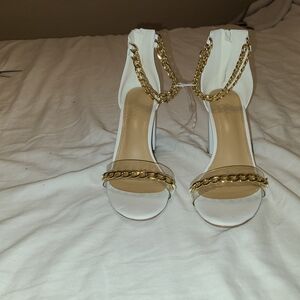 Elevate your look with these chic white heels adorned with bold gold chain details. Perfect for adding a touch of glamour to any outfit.