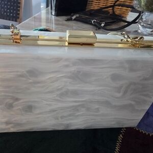 This chic clutch features a sleek white design with elegant gold accents. Perfect for adding a touch of sophistication to any outfit.
