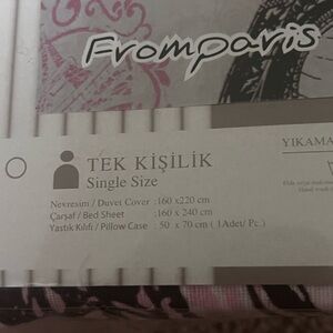 Transform your bedroom with this elegant duvet cover, showcasing a Parisian-inspired design with Eiffel Tower motifs. The white background enhances the pink floral accents, offering a sophisticated and stylish look. Perfect for adding a touch of French elegance to your bedding.