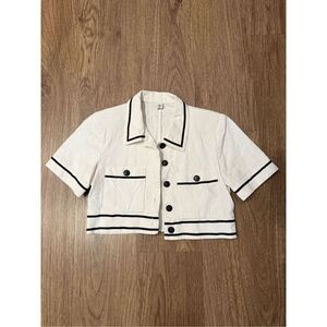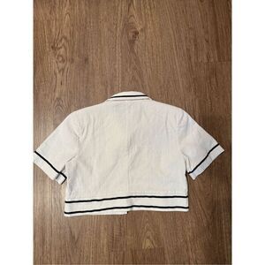 Effortlessly classy! This cropped white blouse features sleek black trim, front pockets, and short sleeves. Perfect for pairing with high-waisted jeans or skirts for a polished look. Size small.