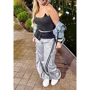 Features: These high waist, baggy sweatpants feature a trendy wide leg silhouette with a stylish striped pattern. They have an elastic waistband for a comfy, relaxed fit, plus unique details like asymmetrical and patchwork accents. Soft, skin-friendly fabric makes them great for lounging or dressing up.