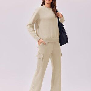 Features: This oversized fleece sweatshirt and wide-leg cargo pants set gives you the ultimate lounge vibe with a fashionable twist. The pullover has a comfy crewneck and thumbhole cuffs for extra warmth. The jogger pants feature a drawstring waist, multiple pockets—including cargo, side, and back for plenty of storage—and a flowy, relaxed fit perfect for moving all day.