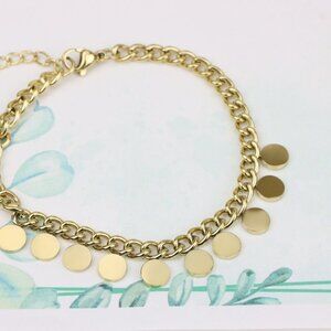 A stunning bracelet crafted in yellow gold tone over high-quality brass, featuring smooth round disc charms for a modern and elegant touch. The adjustable chain allows a perfect fit for any wrist.