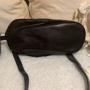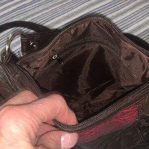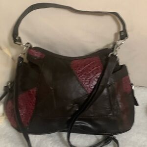 Stylish shoulder/ crossbody bag with a unique brown ,tan and red patchwork design Perfect for adding flair to any leather in red , in glove, leather so soft and snake skin pattern 2 pockets on either side 2 handles one carry/shoulder handle Silvertonehardware ,permanently attached and one adjustable Crossbody strap detachable ones zip pocket inside approximate measurements are.