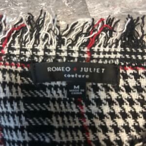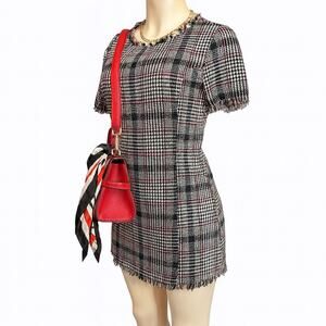 Romeo + Juliet Couture houndstooth plaid mini dress in Women’s Medium. Features black/white houndstooth with red accents, fringe trim at neckline, sleeves, and hem, and a fitted silhouette. Great for casual wear, work, or seasonal styling.
