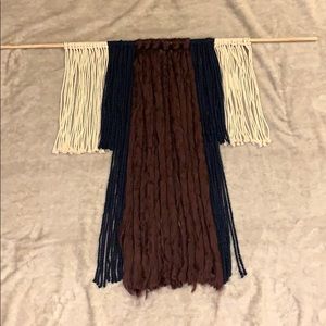 Chic hanging macrame. This matron, midnight blue, and beige macrame would add a bohemian flare to any living area. Wall decor that will add a lived in feel to your space. Wooden dowel measures 3 feet in length.