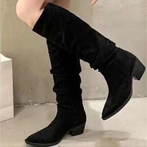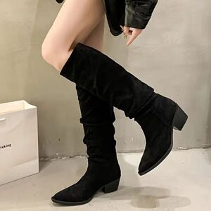 Chic Vintage-Inspired Women's Knee-High Boots with Chunky Heel - Pointed Toe, Mid-Calf Length, Velvet-Lined, Slip-On, Non-Slip Sole for Winter Warmth & Comfort