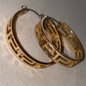 These chic gold hoop earrings feature a unique geometric pattern, perfect for elevating any ensemble with a touch of elegance.